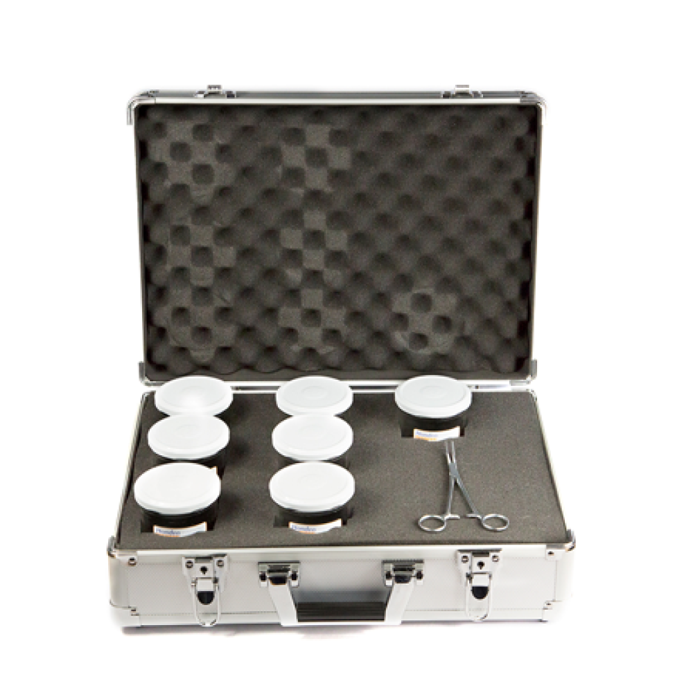 De KNPV Geurkoffer is voorzien van 7 glazen geurpotten, een tang voor het oppakken van de sorteerbuisjes/stof en een kunststof afvalbakje voor bijvoorbeeld de vuile sorteerbuisjes.